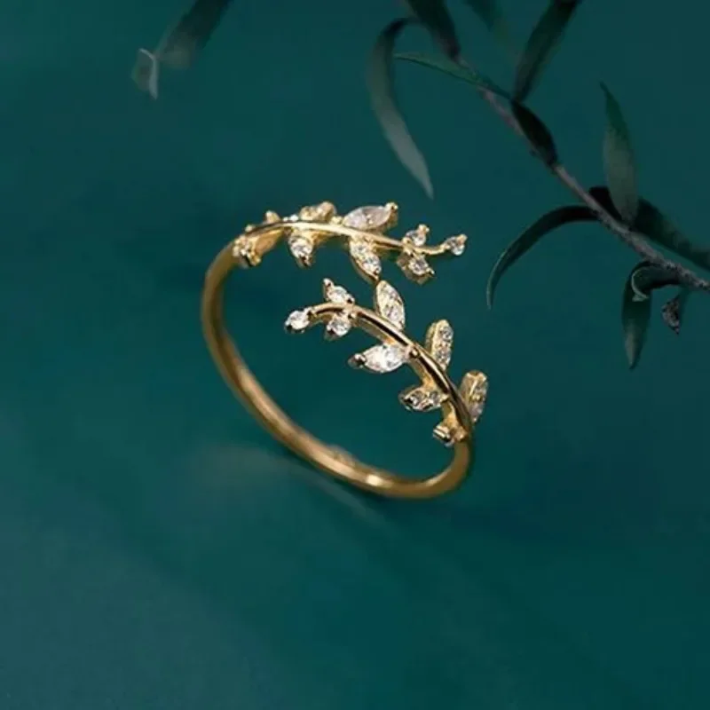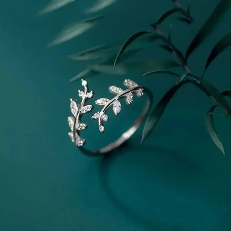 Luckacco Leaf Shape Design Adjustable Opening Rings for Women Sparkling Cubic Zirconia Olive Ring Party Daily Wear Fashion Jewelry