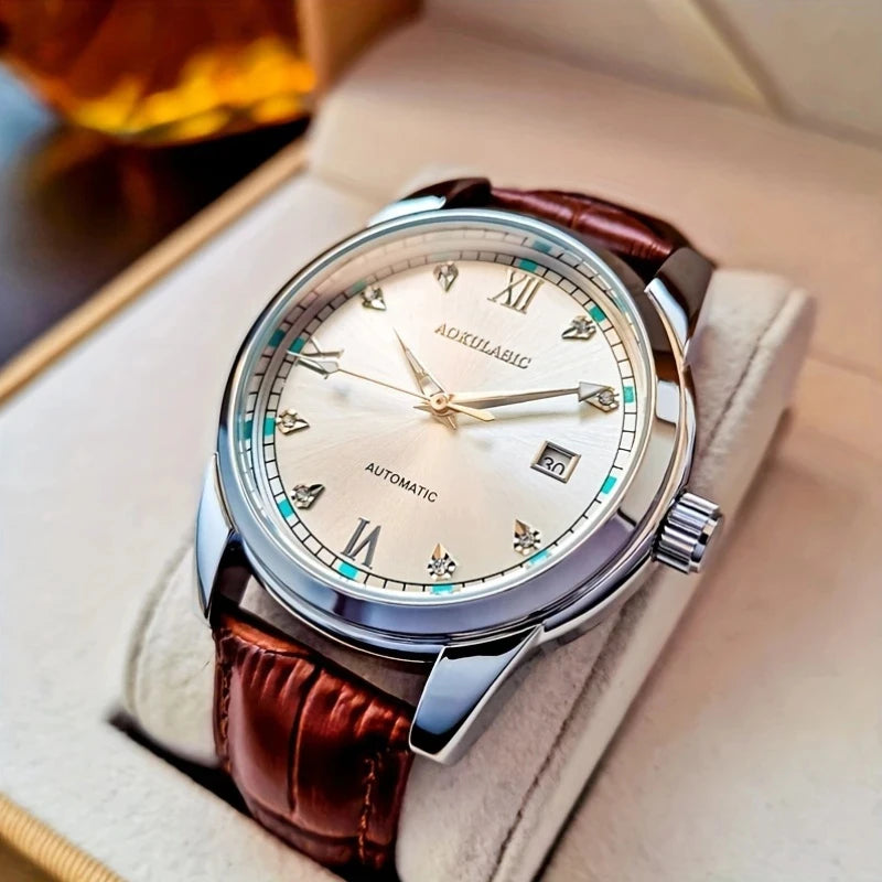 Luckacco New Stylish High-End Business Men's Watch, Fully Automatic Mechanical Watch, Skeleton Design, Round Dial, with Calendar Display, Leather Strap, Fashionable Accessory, Suitable for Business and Casual Wear, European, American, Japanese, and K